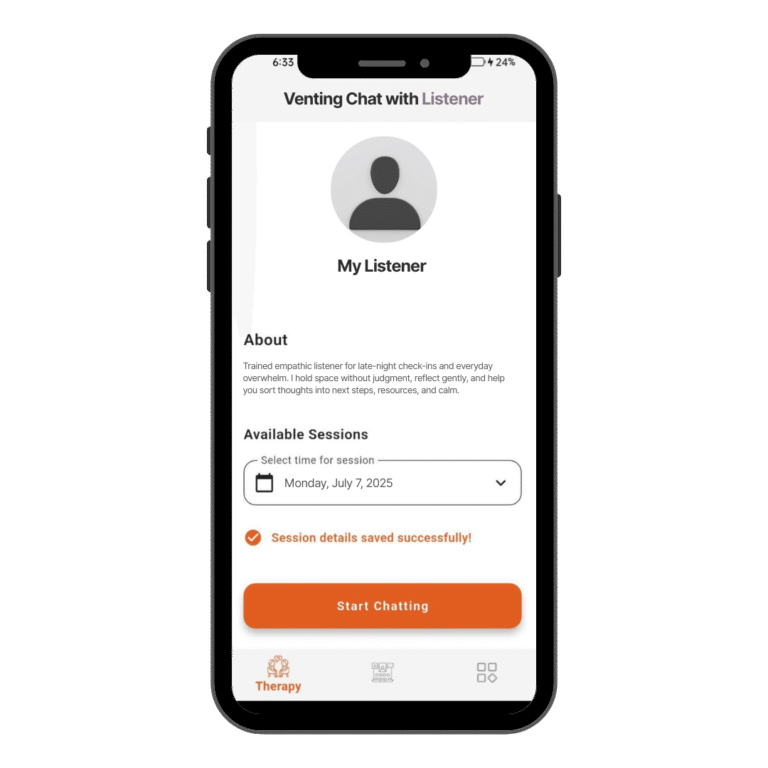 Therapy sessions are by professional therapists who provide professional advice or interventions if necessary. On the other hand, venting sessions connect you with trained listeners who offer empathetic listening and support without providing therapeutic interventions. Listeners are not mental health professionals, they are more like a friend you can rely on.